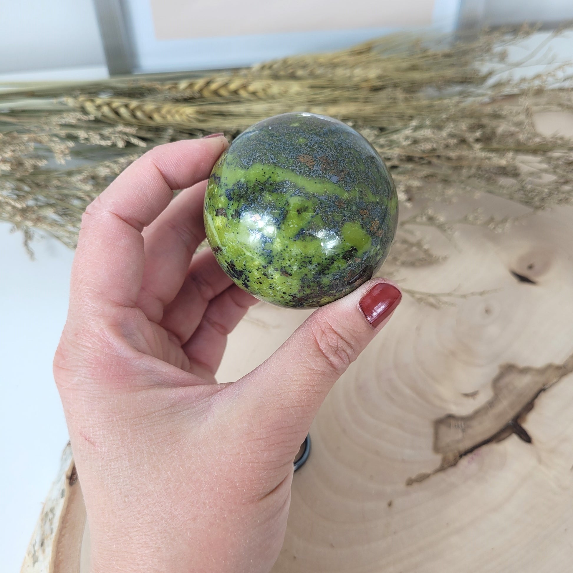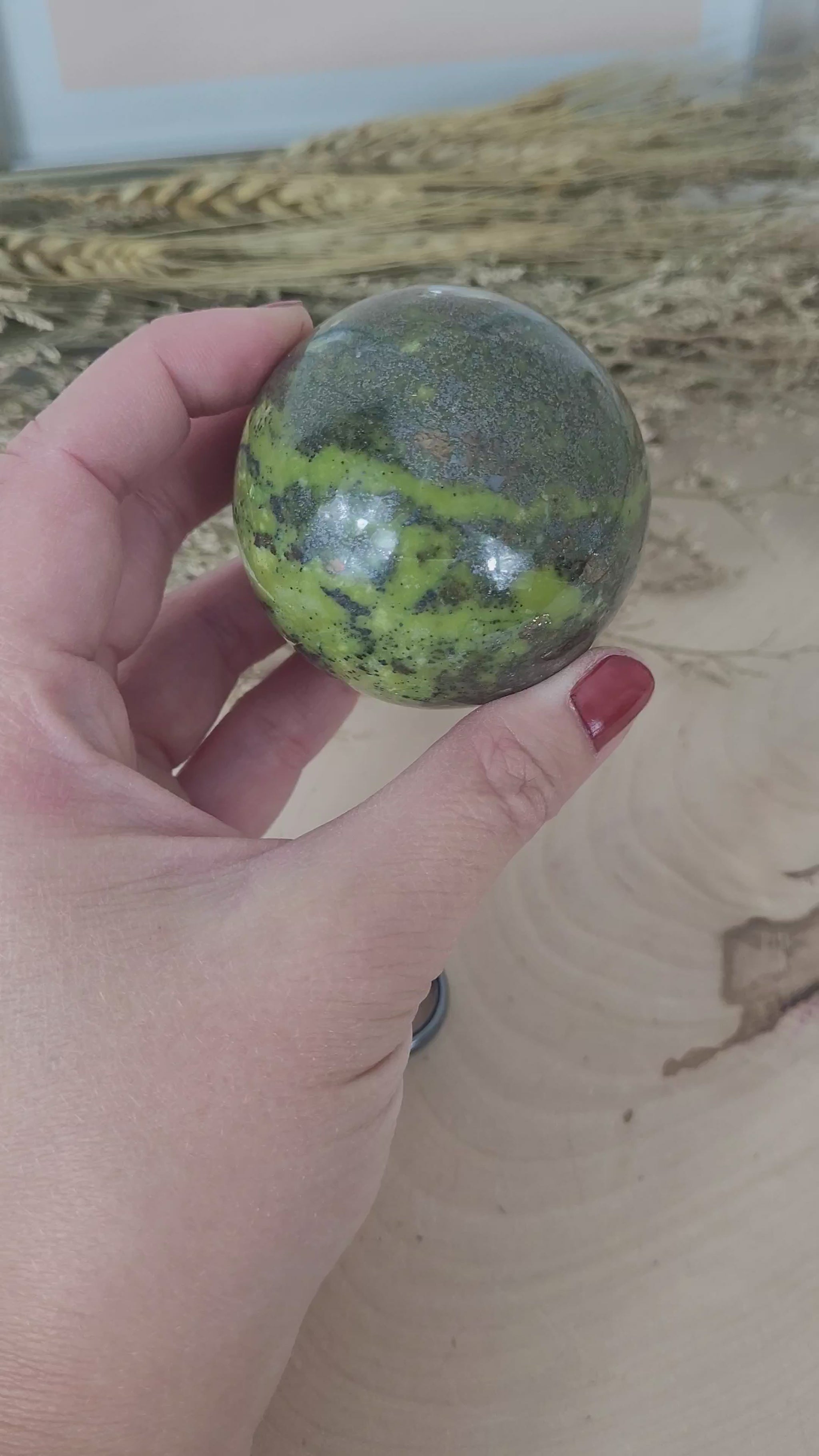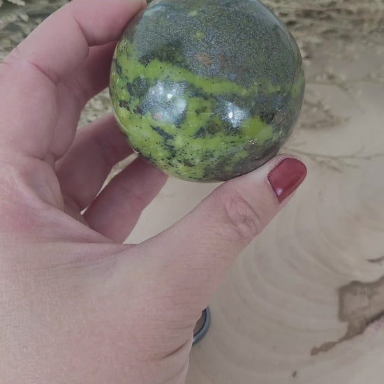 Diese wunderschöne Serpentin Kugel fasziniert mit ihre charakteristischen, intensiv grünen Naturfarbtönen und ihrer Maserung über das gesamte Gestein. Zudem fasziniert diese Serpentin Kugel mit ihren zahlreichen und großen Einschlüssen von Pyrit. Diese Varietät des Serpentins, auch unter dem Namen Serpentin Jade bekannt, hat häufig Pyrit Einschlüsse mit im Gestein.