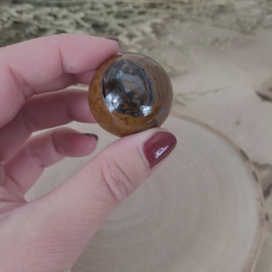 Diese wunderschöne Tigereisen Kugel fasziniert mit ihrer wunderschönen Bänderung und Mustern über das gesamte Gestein. Beim Tigereisen handelt es sich um eine zig Millionen Jahre alten Gesteinsverwachsung, bestehend aus Tigerauge, Jaspis und Hämatit teils auch mit Magnetit. Der wunderschöne Schimmer von Tigerauge und der fast schon metallische Glanz vom Hämatit machen den Tigereisen in seiner Schönheit unverkennbar. Diese Form der Gesteinsverwachsung des Tigereisens kommt in Südafrika und Australien vor.