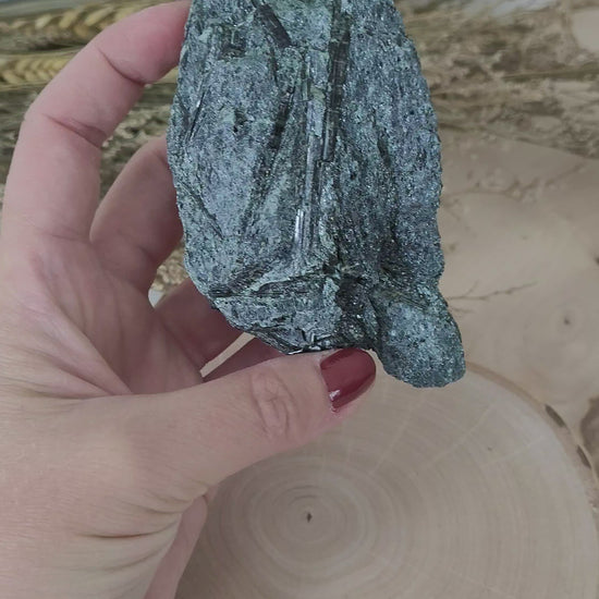 Diese wunderschöne schwarzen Turmaline in ihrem grünen Glimmerschiefer Gebirgsmuttergestein, auch Chloritschiefer genannt, faszinieren mit ihrer ausgeprägten Kristallbildung und ihrem wunderschönen Schiefer Muttergestein, welches über und über einen metallischen Glanz hat.