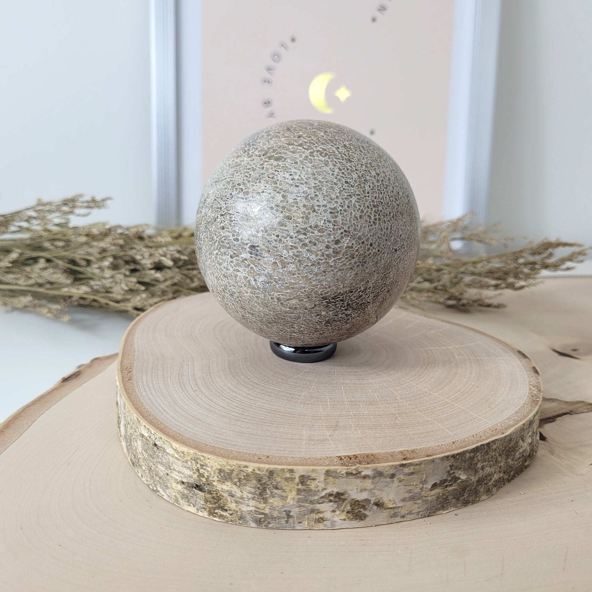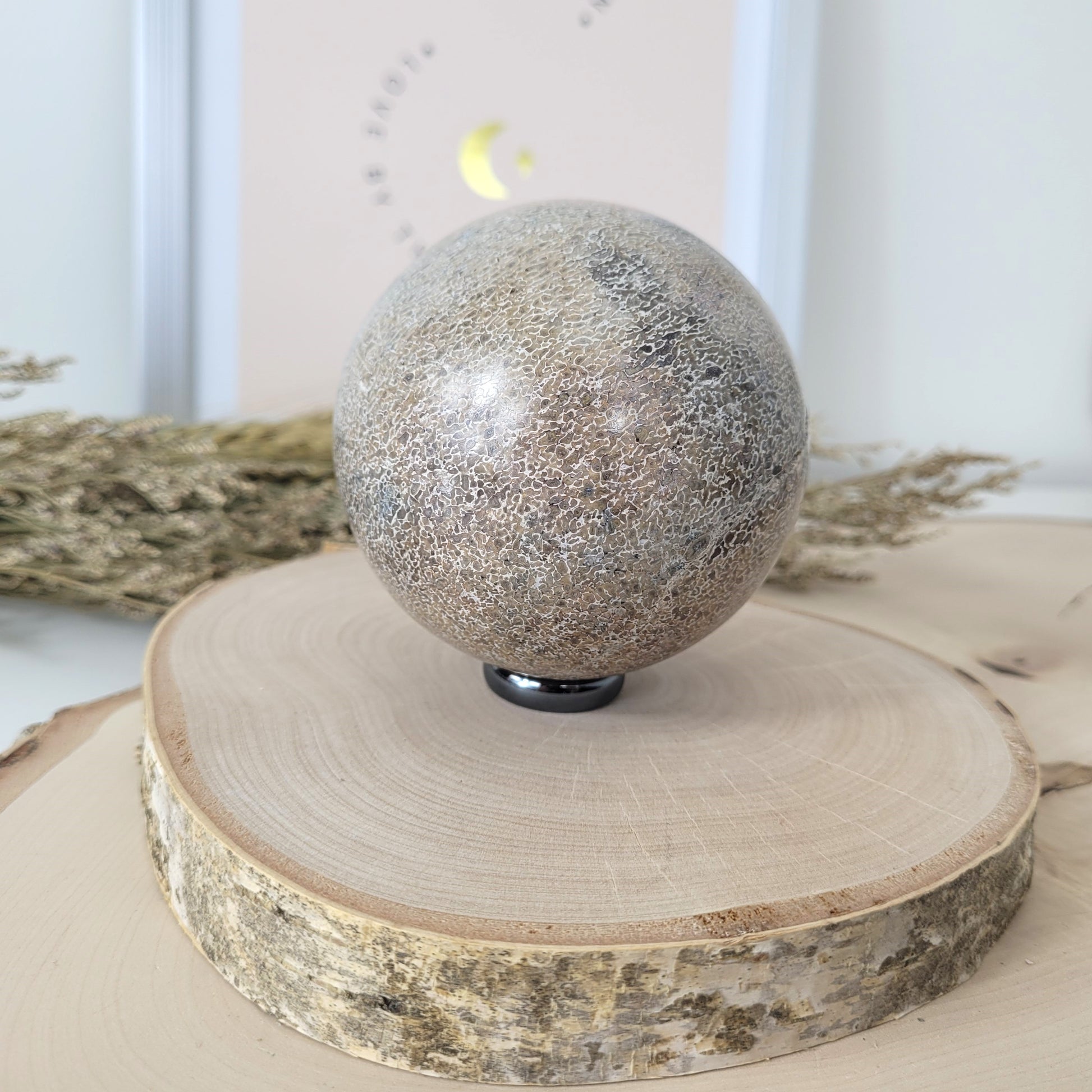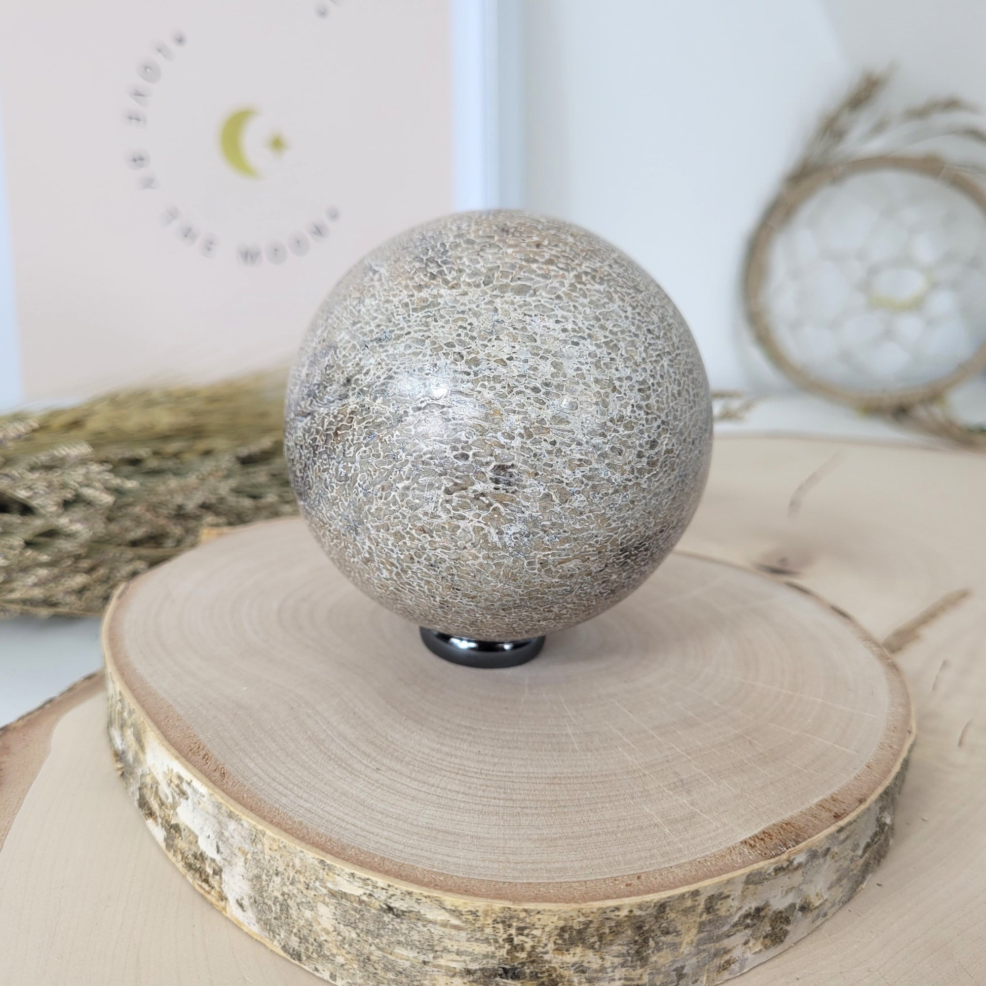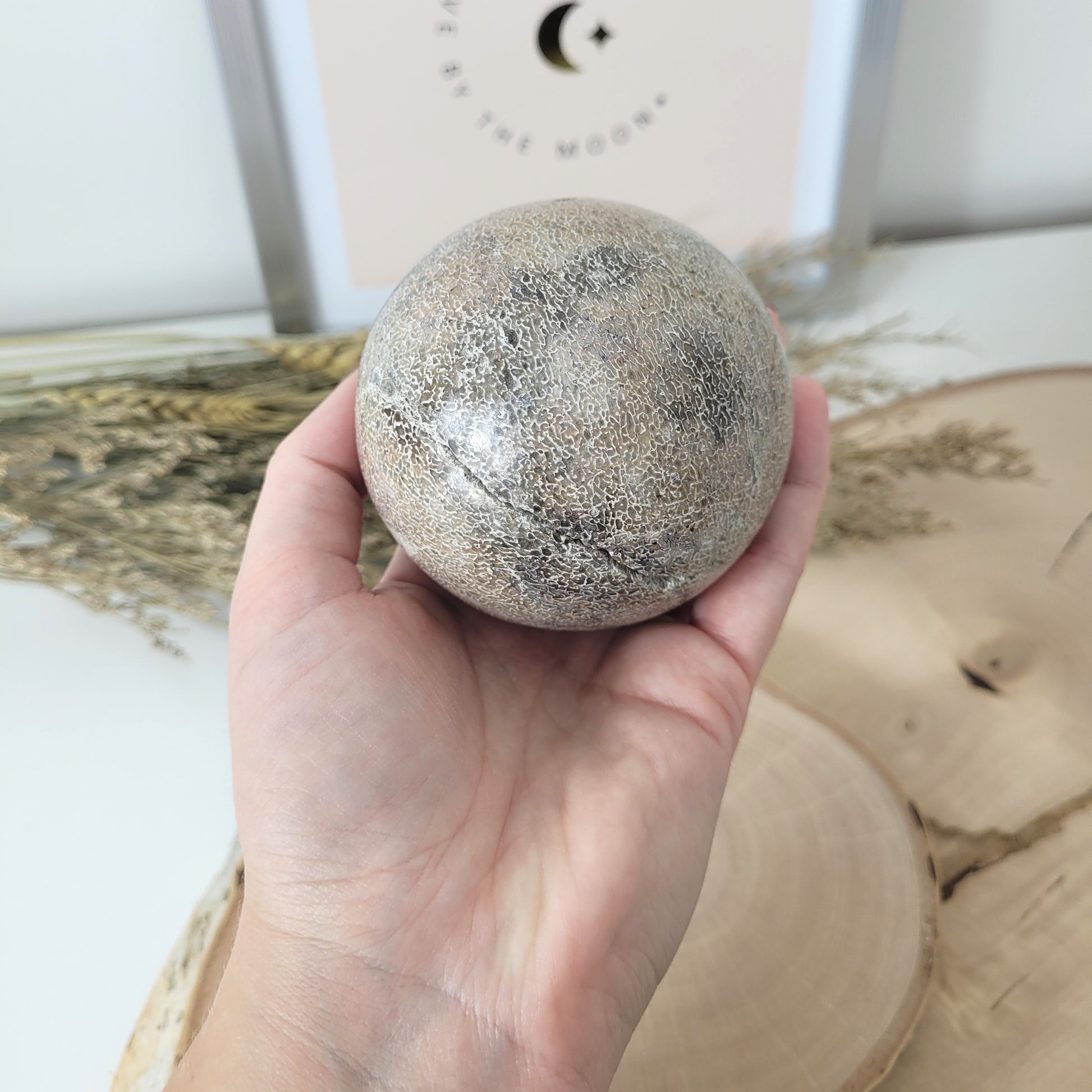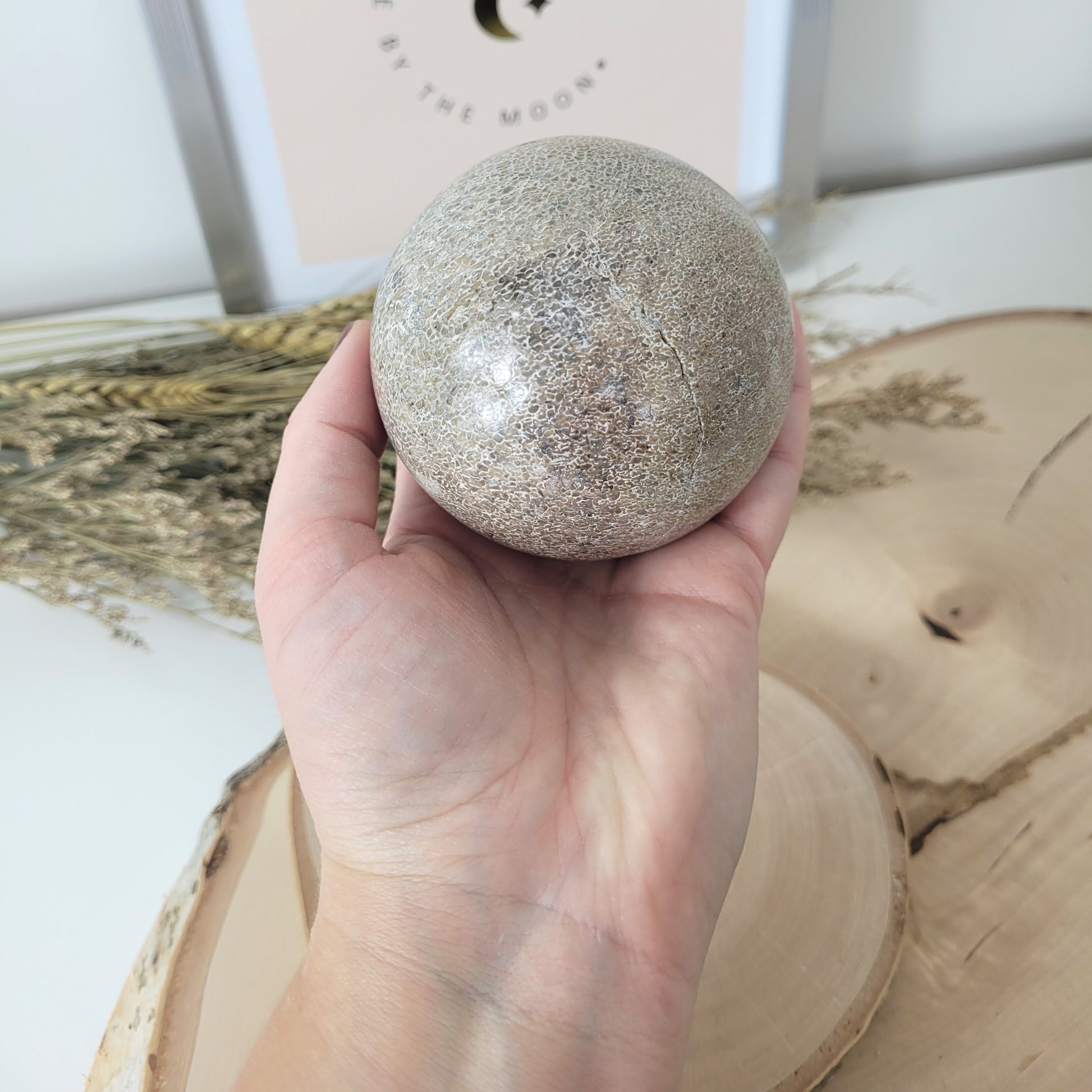 Die geschliffene Kugel aus versteinertem Dinosaurier Knochen hat einen Durchmesser von 7,5 cm und wiegt 594g. Es handelt sich genau um die Kugel, die auf den Bildern zu sehen ist.