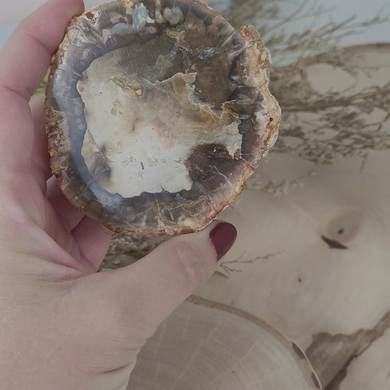 Diese Versteinerte Holz Baumscheibe ist rund um naturbelassen und nur auf der Vorderseite poliert und hat eine Größe von 7,8x7,5cm und ein Gewicht von 220g.