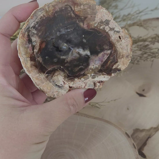 Das besondere am Versteinertem Aurakien Holz sind seine faszinierenden Muster im Stamminneren, teils mit einem farbenfrohen Innenleben durch Eiseneinschlüsse und teils auch mit Verwachsungen mit Quarzkristallen im Inneren.