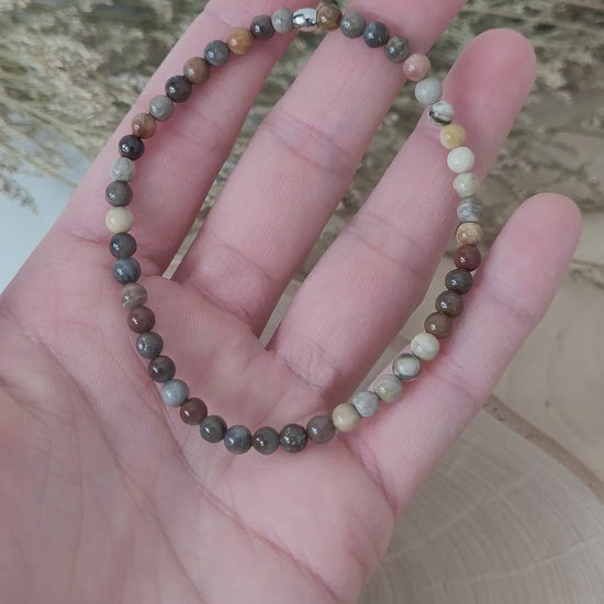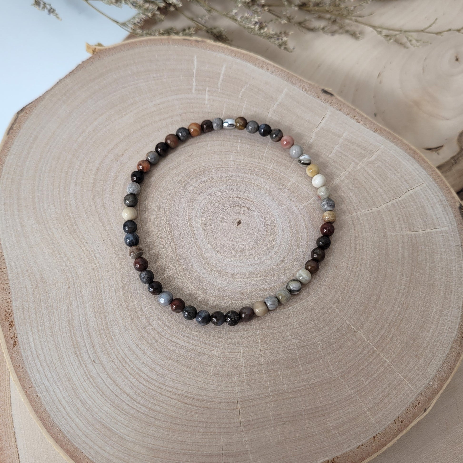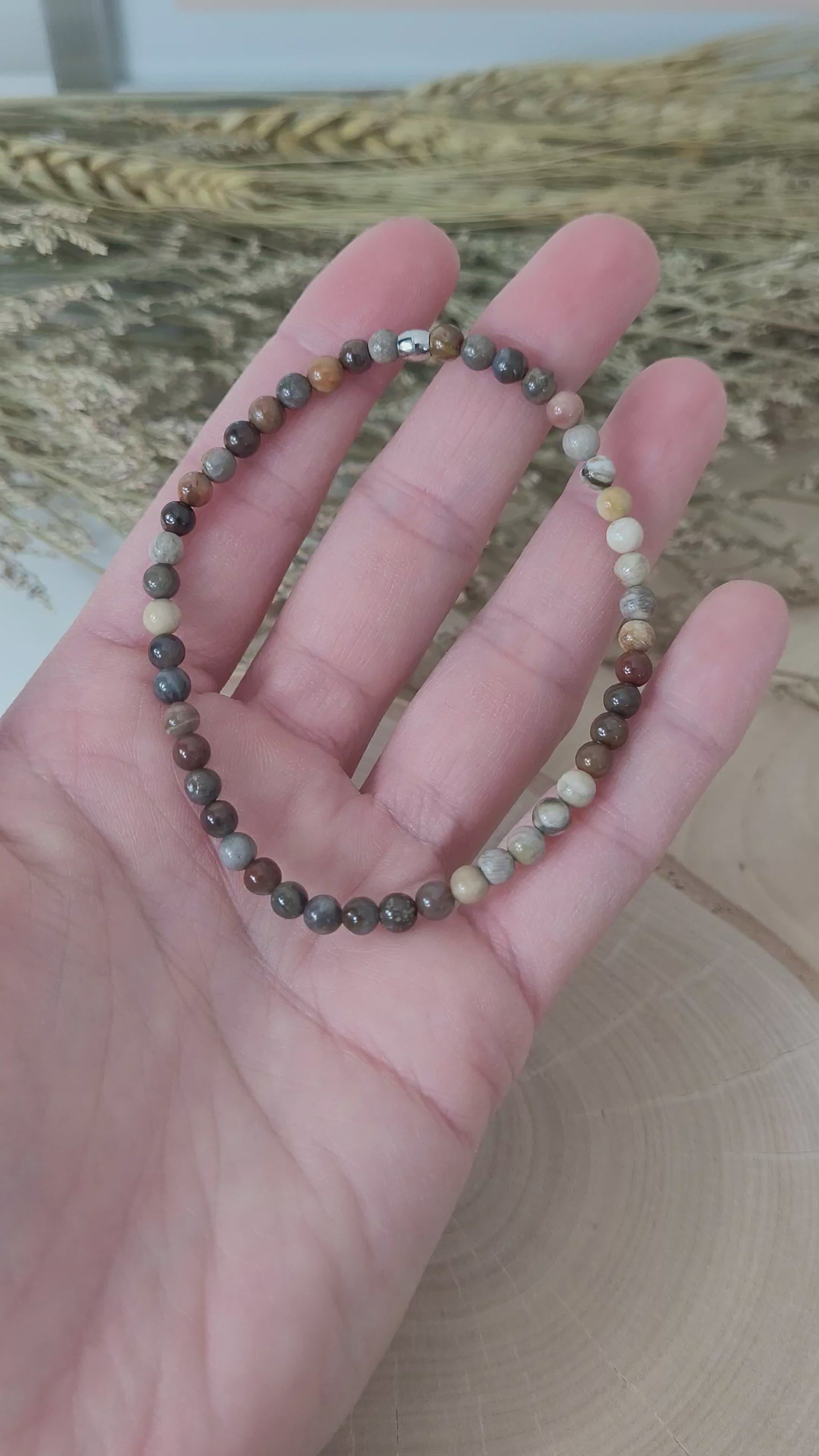 Elastisches Armband aus 4 mm versteinerten, fossilen Holz Perlen und einer Endperle (zum eleganten Kaschieren des Endknotens) aus hochwertigem Edelstahl (rostfrei, wasserfest). Armbandlänge ca. 19 cm.