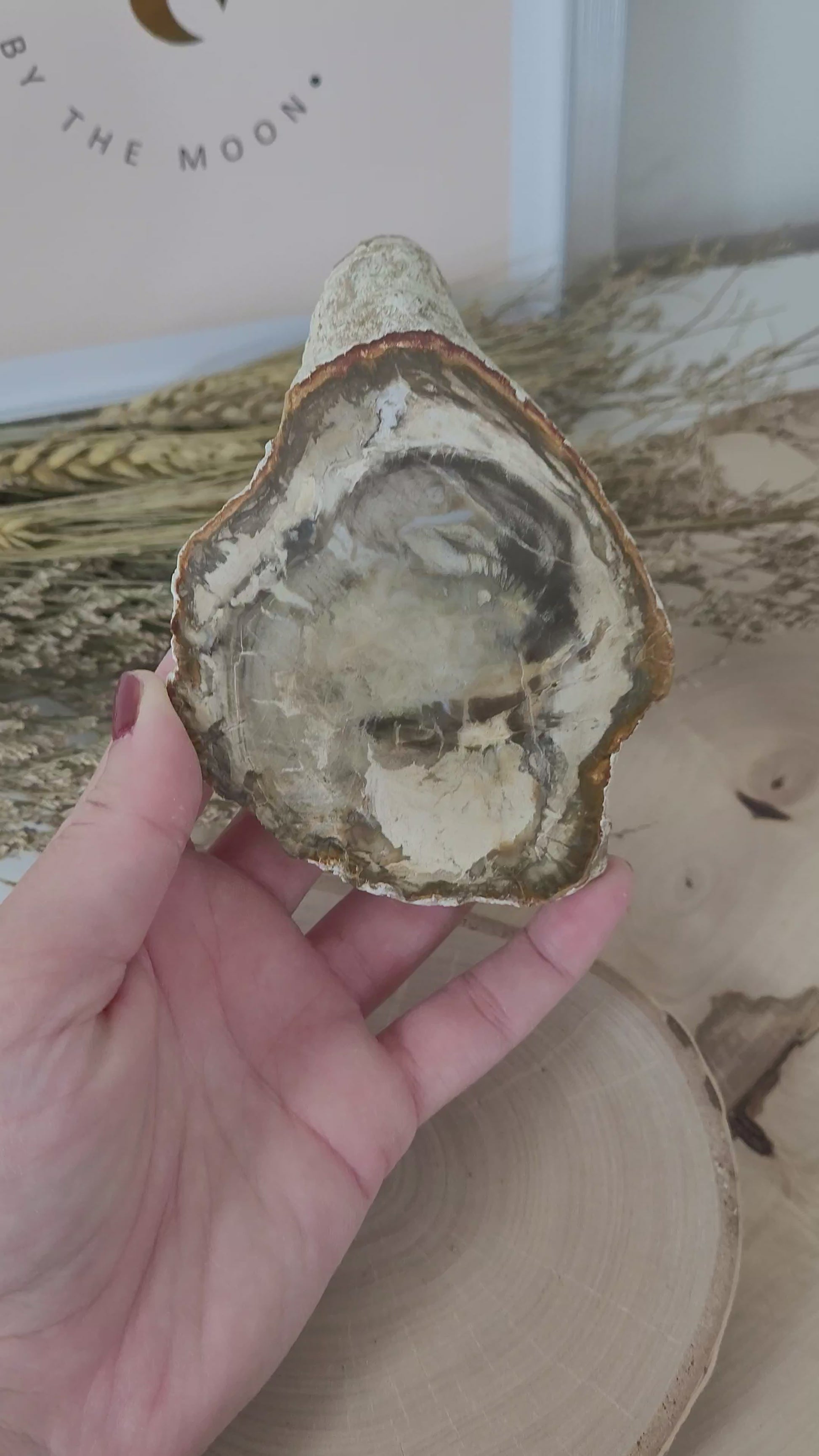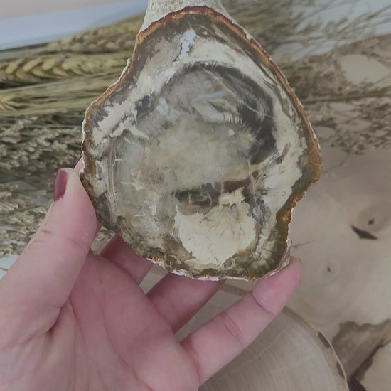 Das besondere am Versteinertem Aurakien Holz sind seine, teils sogar farbenfrohen Muster im Stamminneren und teils auch mit Verwachsungen mit Quarzkristallen im Inneren.