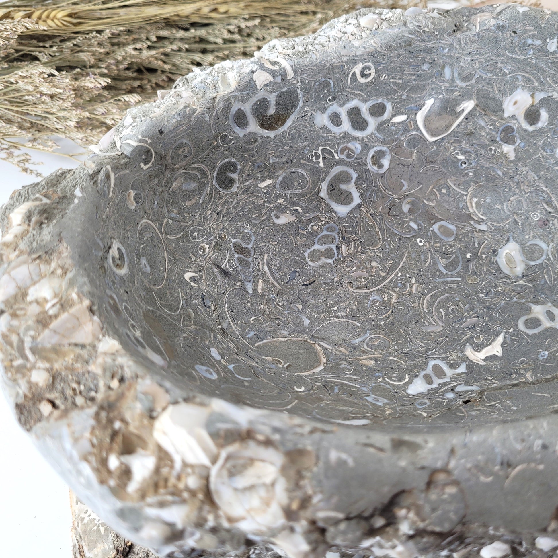 Das Gestein ist bei diesen XL Schalen komplett naturbelassen und nur das Innere in Form einer großen Schale poliert. Die verschiedenen Fossilien im Gestein sind wundervoll zu erkennen. Da es sich hier um ein naturbelassenes Naturwunder handelt und nicht künstlich in Szene gesetzt, kann an an der einen oder anderen Stelle im Rohgestein auch eine Muschelschale fehlen oder Lücken im Gestein sein. Die Schalen sind in sich sehr kompakt, schwer und stabil und tragen mit sich Millionen von Jahren Erdgeschichte und Magie.