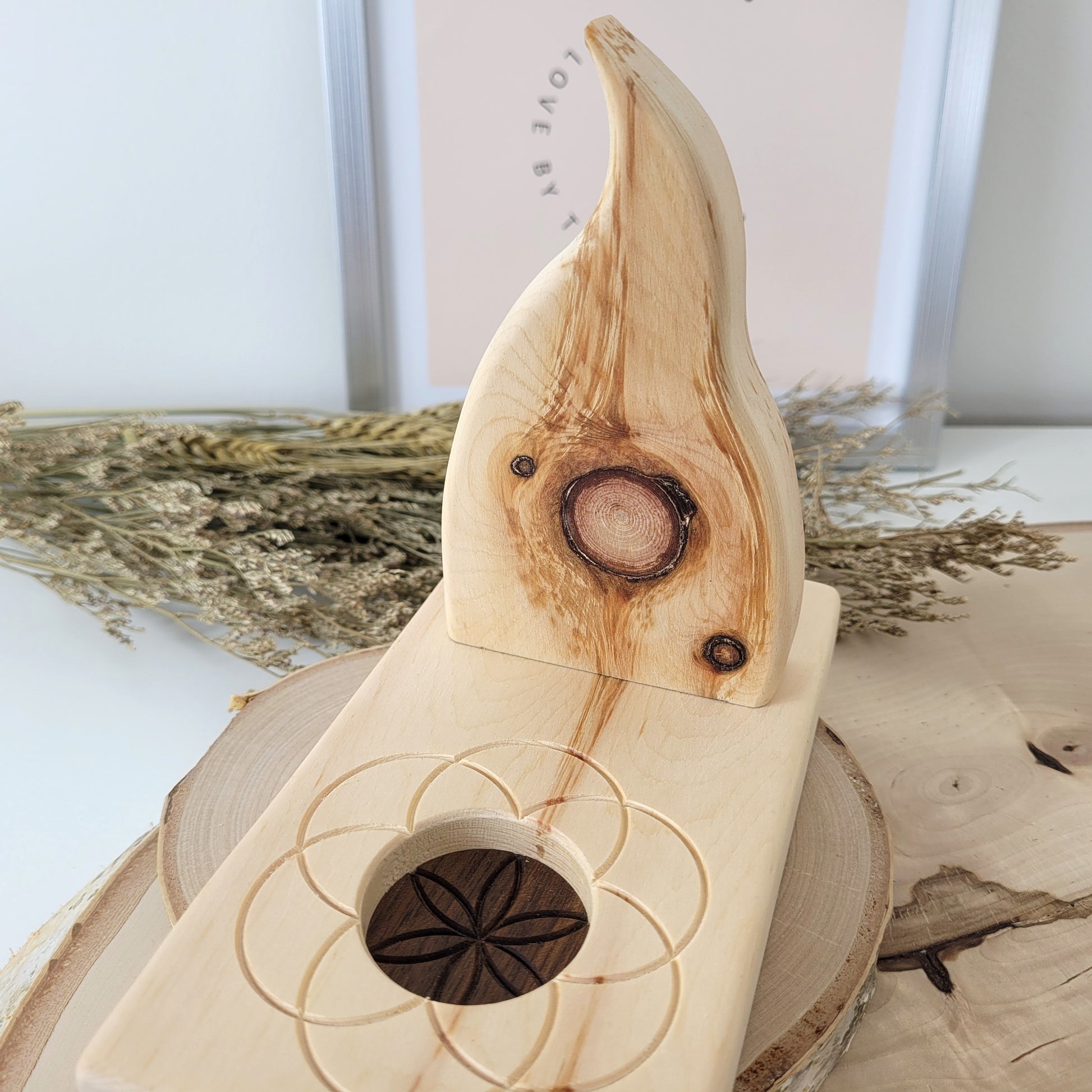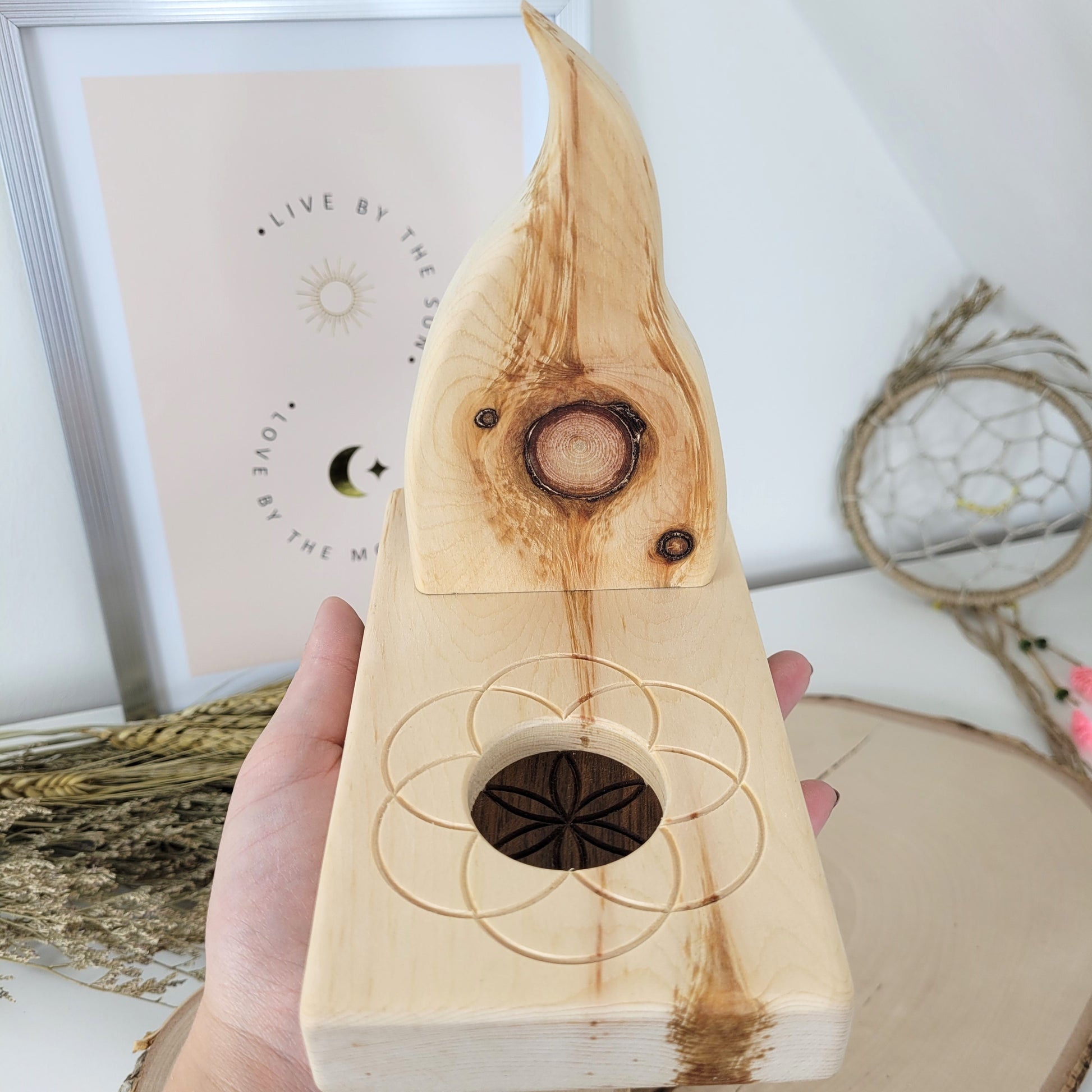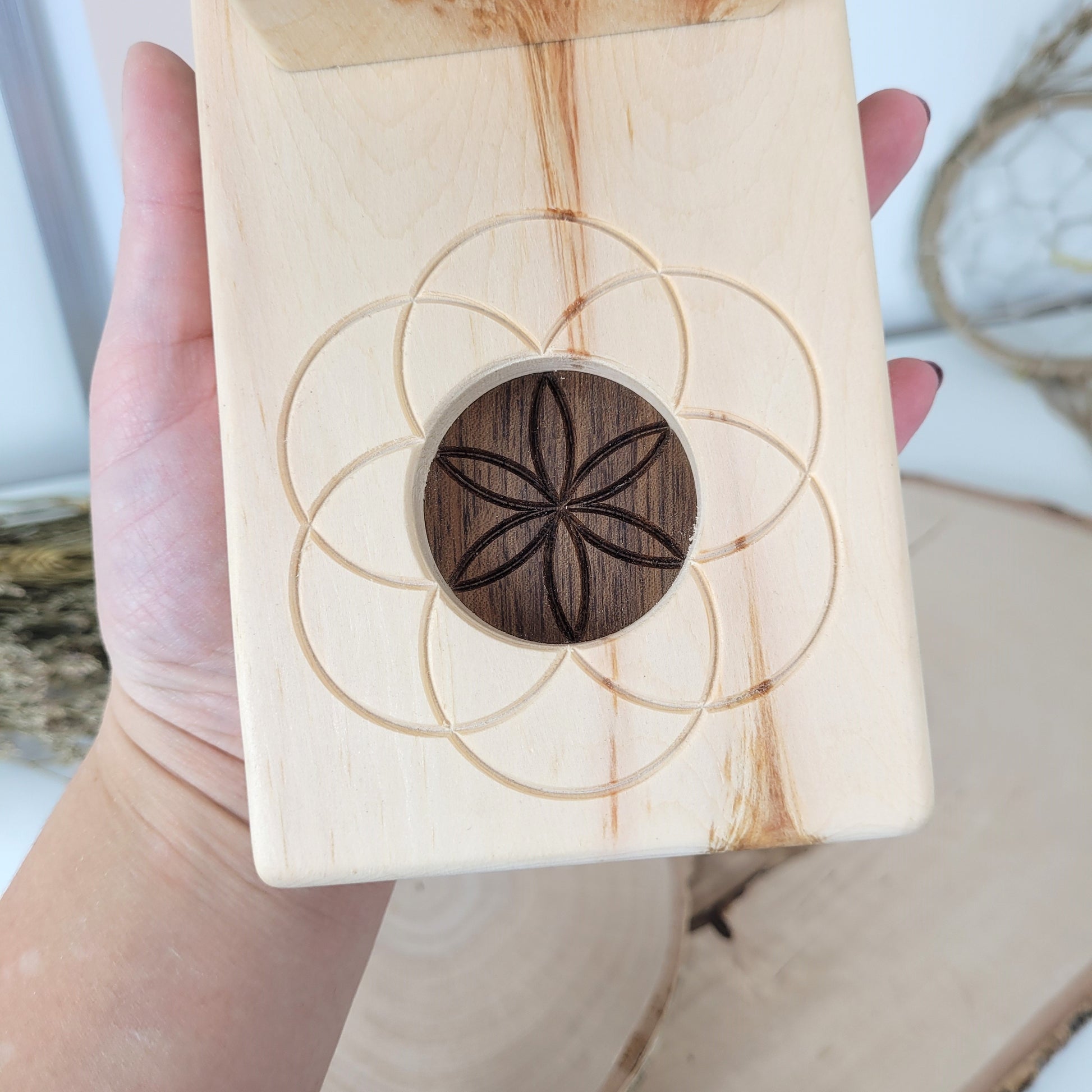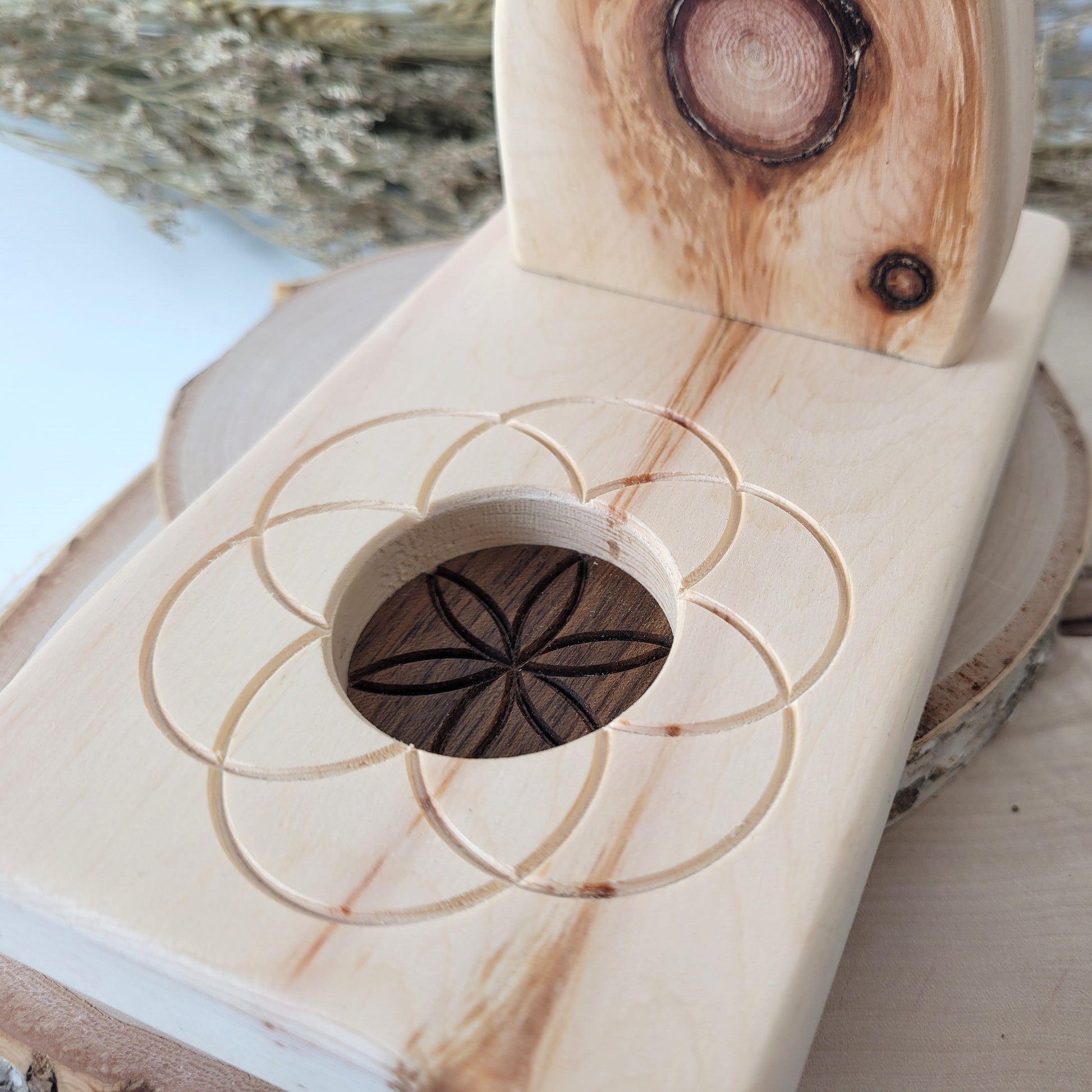 Zirbenholz Seelenlicht "Seelenweg" Teelichthalter mit Samen des Lebens Gravur, der Samen aus Nussholz