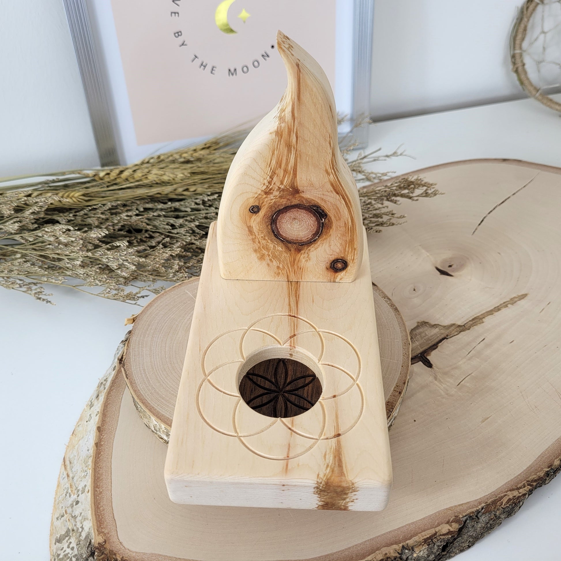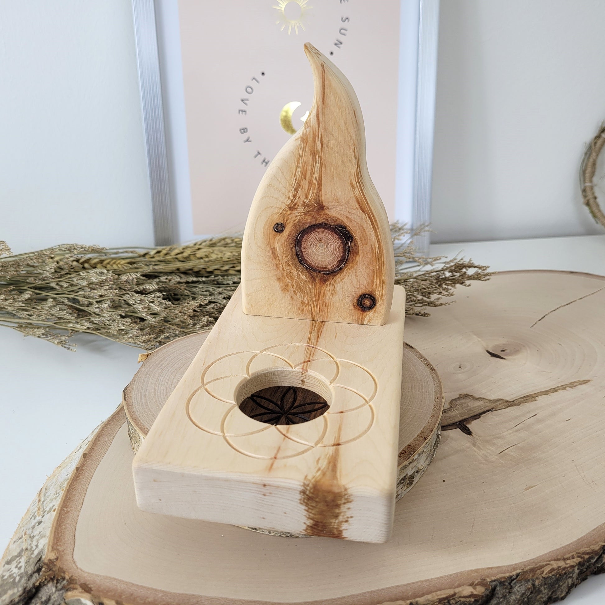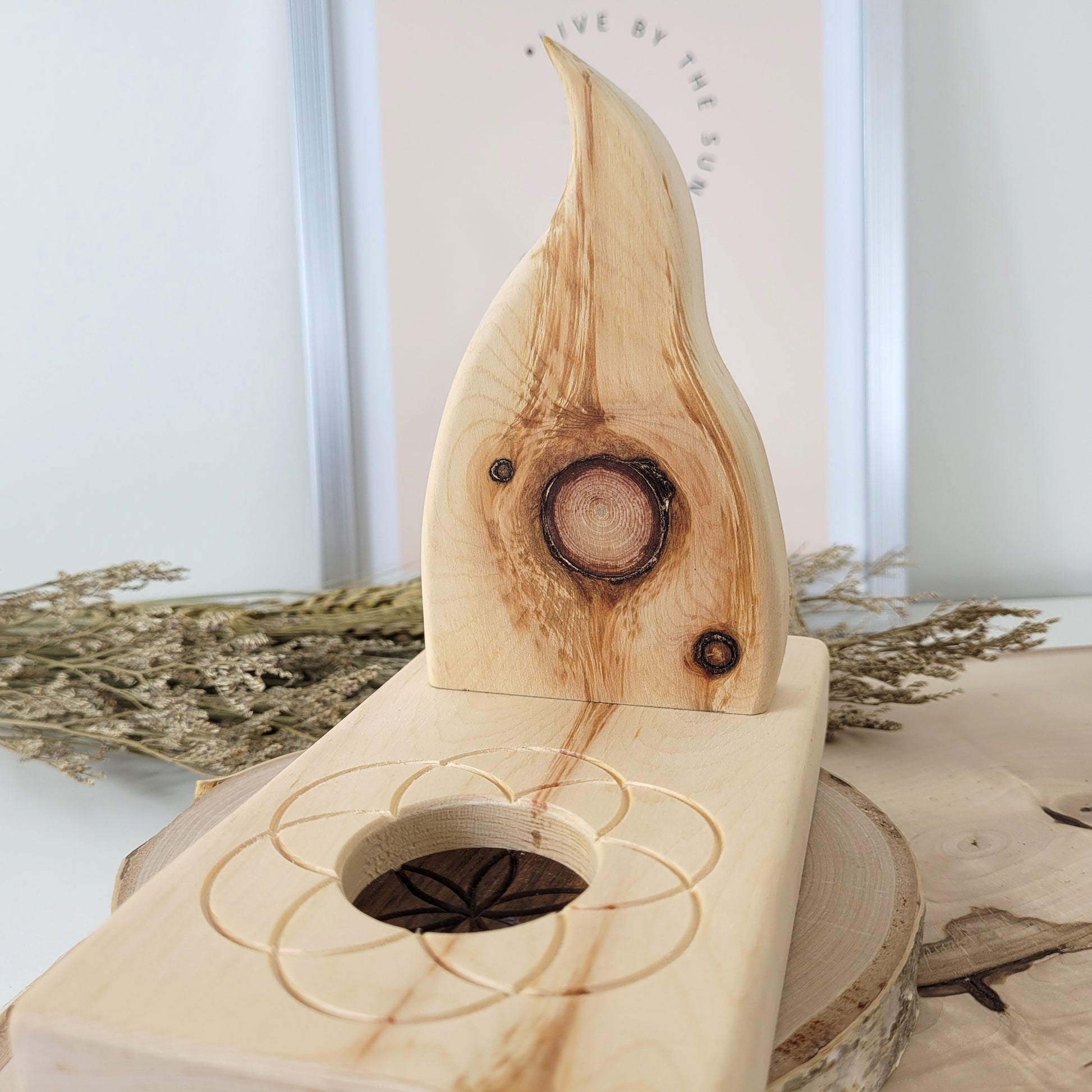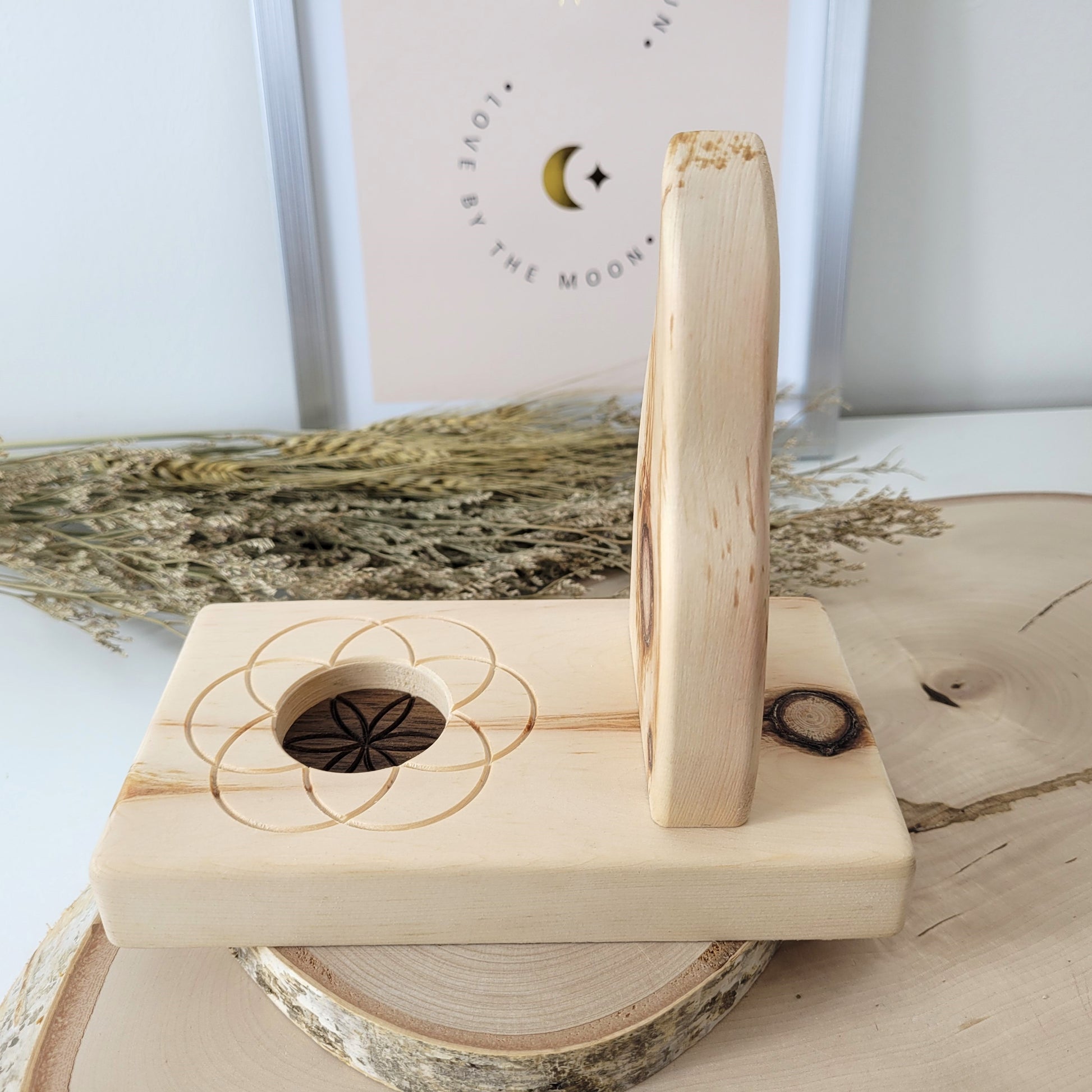 Zirbenholz Seelenlicht "Seelenweg" Teelichthalter mit Samen des Lebens Gravur, der Samen aus Nussholz