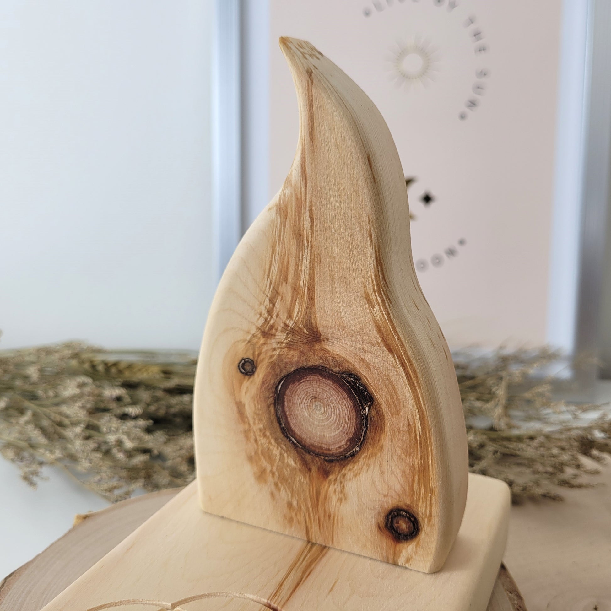 Dieses wunderschöne aus Zirbenholz geschliffene Freiform Wesen bezaubert mit seiner Zirbenholz typischen wunderschönen Maserung, den Ästen im Holz und natürlich seinen zauberhaften Duft. Die Form ist geleitet durch die natürlichen Formen des Holzes entstanden. Die Zirbenholz Freiform ist fest verankert auf ihrem Zirbenholz Sockel als Teelichthalter mit dem kraftvollen Symbol "Samen des Lebens" als Gravur rund um die Aushöhlung für das Teelicht. Das Innere der Blume, also der Samen selbst ist aus Nussholz geschliffen.